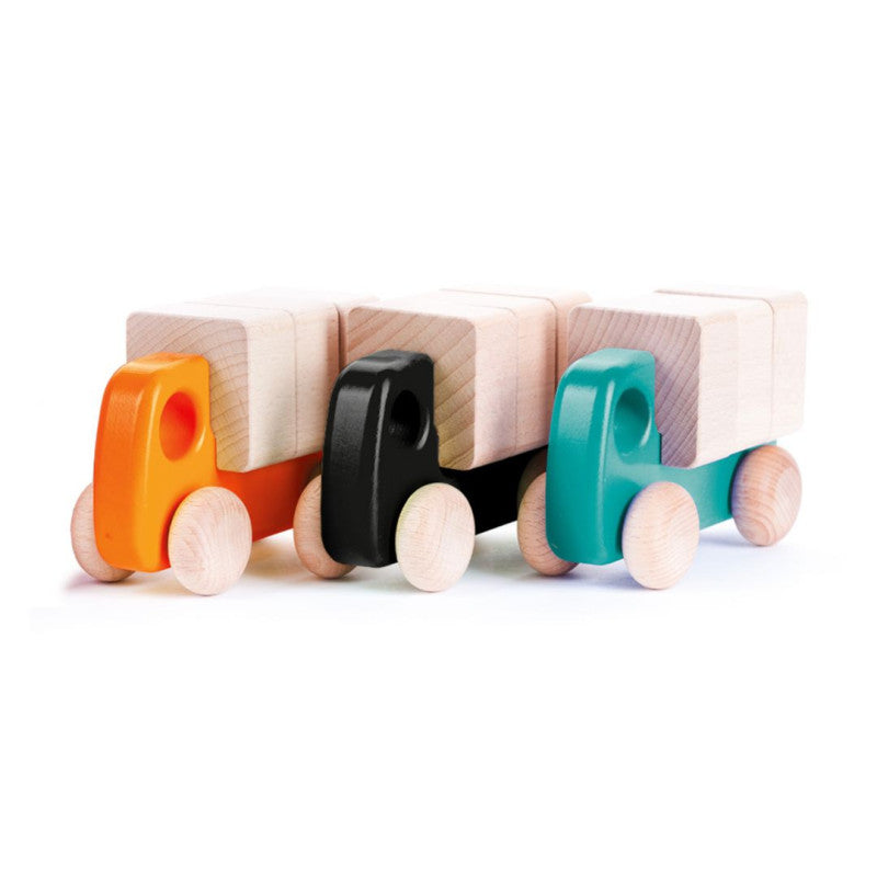 Na pace ciężarówki znajdują się trzy kolorowe, drewniane klocki, które można zdejmować, przestawiać i układać zarówno na pojeździe, jak i poza nim. Zabawa rozwija motorykę i wyobraźnię oraz uczy podstaw porządkowania i sekwencji.