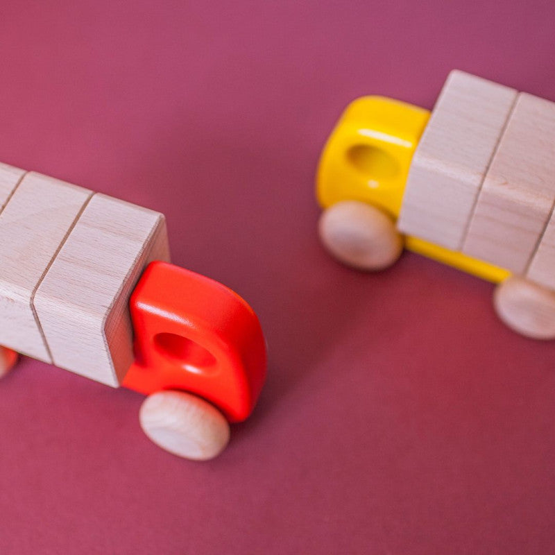 Na pace ciężarówki znajdują się trzy kolorowe, drewniane klocki, które można zdejmować, przestawiać i układać zarówno na pojeździe, jak i poza nim. Zabawa rozwija motorykę i wyobraźnię oraz uczy podstaw porządkowania i sekwencji.