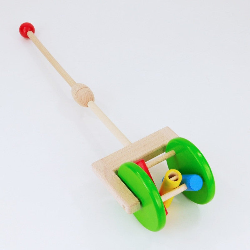 To dzwoneczki obrotowe. Czy to jest grzechotka? Owszem, ale to osobliwy przypadek. Ma dwa wielkie koła i uchwyt. Można z nią chodzić i jeździć po podłodze. To nic innego niż pchacz! Trzy dzwoneczki w środku podczas obrotu zmieniają swoje położenie i fajnie podskakują! To sprawia, że tak brzęczą. Wydawane dźwięki intrygują dziecko i zachęcają do zabawy, która przynosi same korzyści. Zabawka wspomaga rozwój zdolności manualnych i przyczynia się do rozwoju motoryki dużej, angażując ruchy rąk i ciała. Wspiera także stawianie pierwszych kroków dziecka.