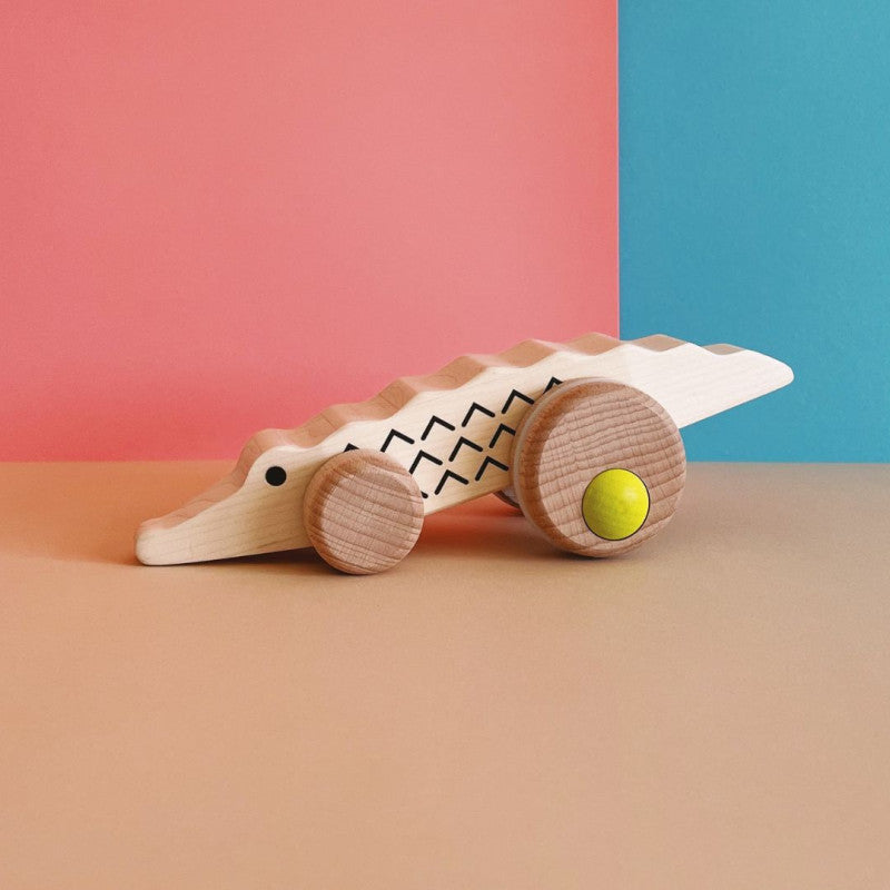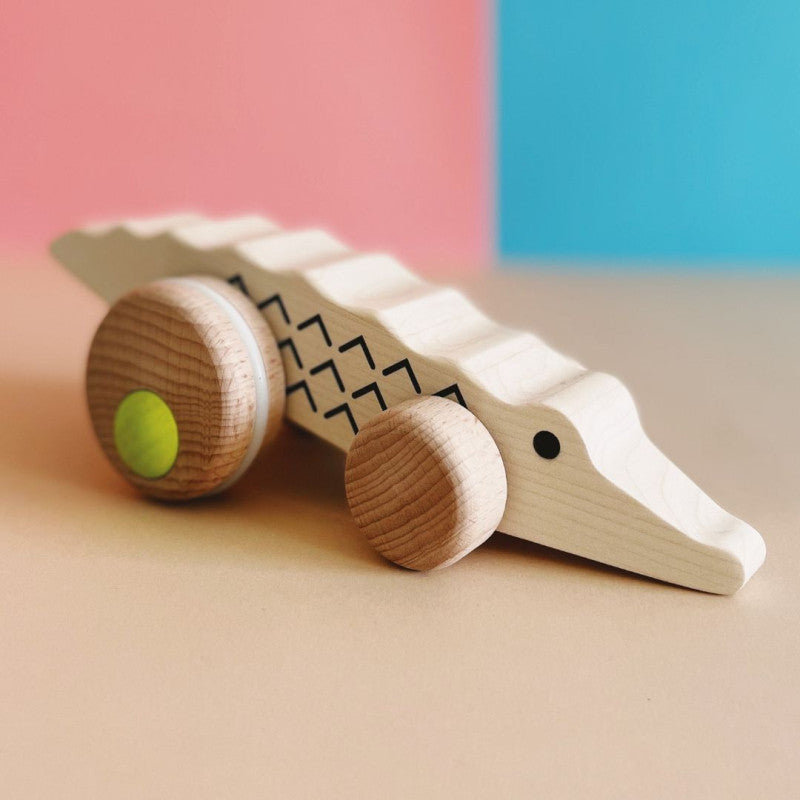 Drewniany Kajman Vintage to zabawka, która zaskakuje swoim ruchem – gdy dziecko go popycha, kajman lekko podskakuje, wywołując radość i zachęcając do dalszej zabawy. Dzięki temu angażuje uwagę najmłodszych i pobudza ich ciekawość.