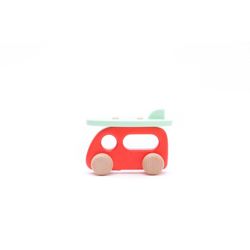 Ten drewniany kamper zabiera w podróż nie tylko wyobraźnię, ale i deskę surfingową. Deska jest zdejmowana i można ją łatwo zamocować z powrotem na bagażniku, co dodaje zabawie realizmu i radości z działania.