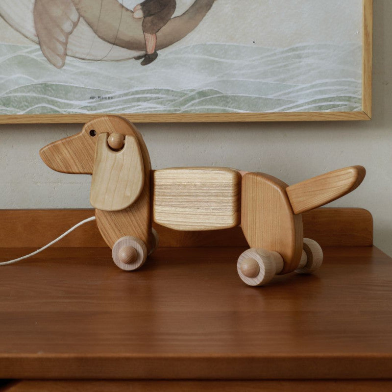 Drewniany duży jamnik na kółkach to urocza i funkcjonalna zabawka, która stanie się ulubionym towarzyszem spacerów Twojego dziecka. Dzięki poręcznemu sznurkowi i ruchomym uszkom jamnik porusza się z gracją, zachęcając malucha do aktywności i eksplorowania otoczenia. Zabawki w kształcie zwierząt rozwijają empatię, wrażliwość oraz uczą szacunku i troski wobec zwierząt.