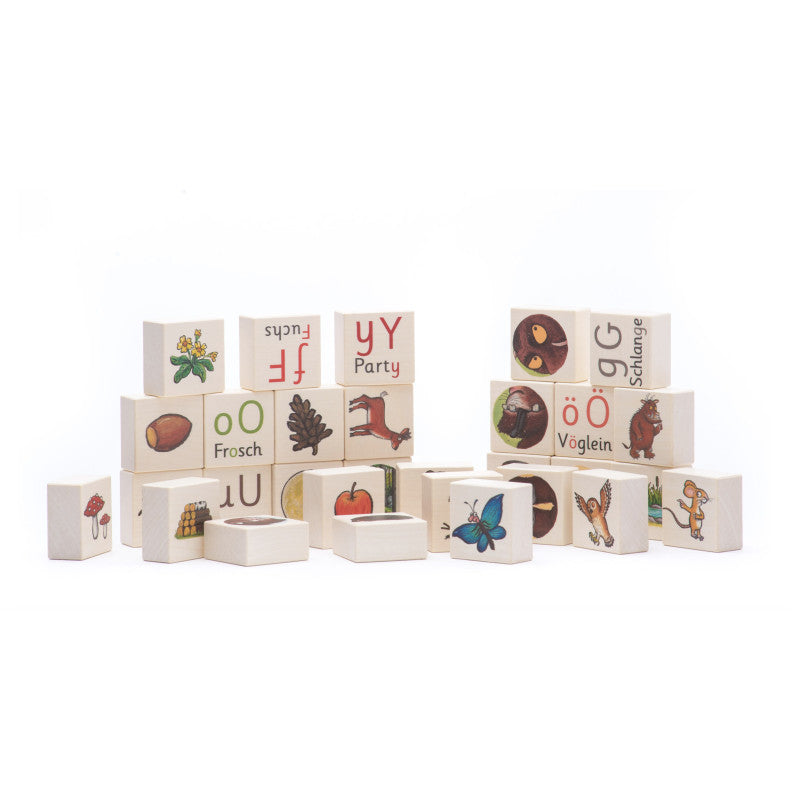 Zabawka Alfabet Gruffalo to zabawka edukacyjna, która w sposób zabawny wspomaga naukę niemieckiego alfabetu. Zestaw zawiera 26 elementów, z których każdy przedstawia literę i słowo zaczynające się na tę literę po jednej stronie, a po drugiej stronie znajduje się obrazek ilustrujący to słowo. Doskonała do rozwijania umiejętności wczesnego czytania i pisania oraz koordynacji ręka-oko.