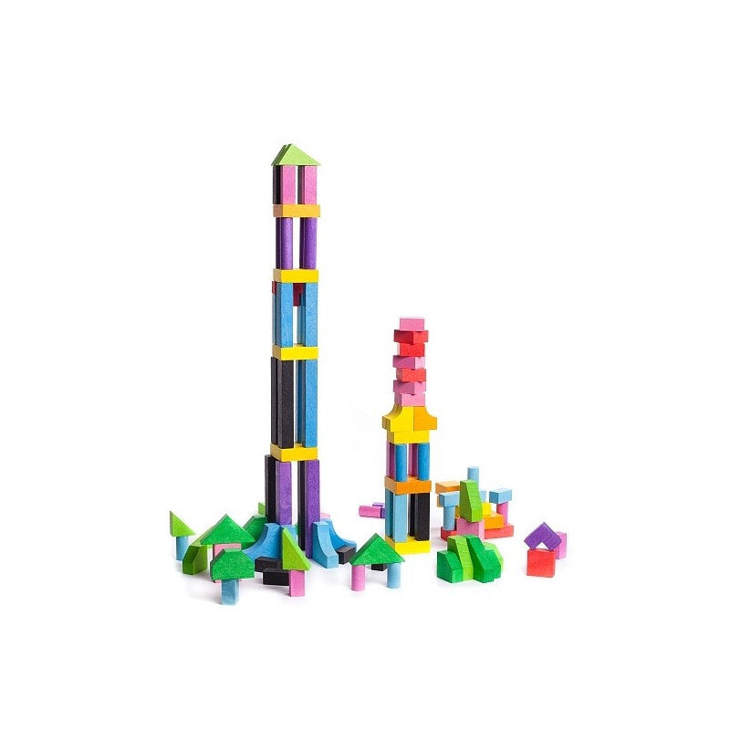 Zestaw 102 kolorowych, drewnianych elementów o różnych geometrycznych kształtach, które dają dzieciom nieograniczone możliwości budowania. Z klocków można tworzyć zamki, pałace, wieże i wiele innych konstrukcji - wszystko zależy od wyobraźni małego budowniczego. Zabawa rozwija kreatywność, cierpliwość i radość z tworzenia.