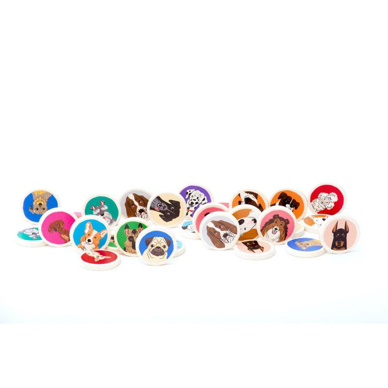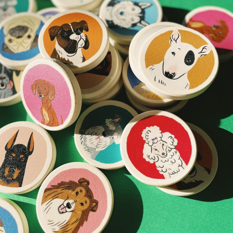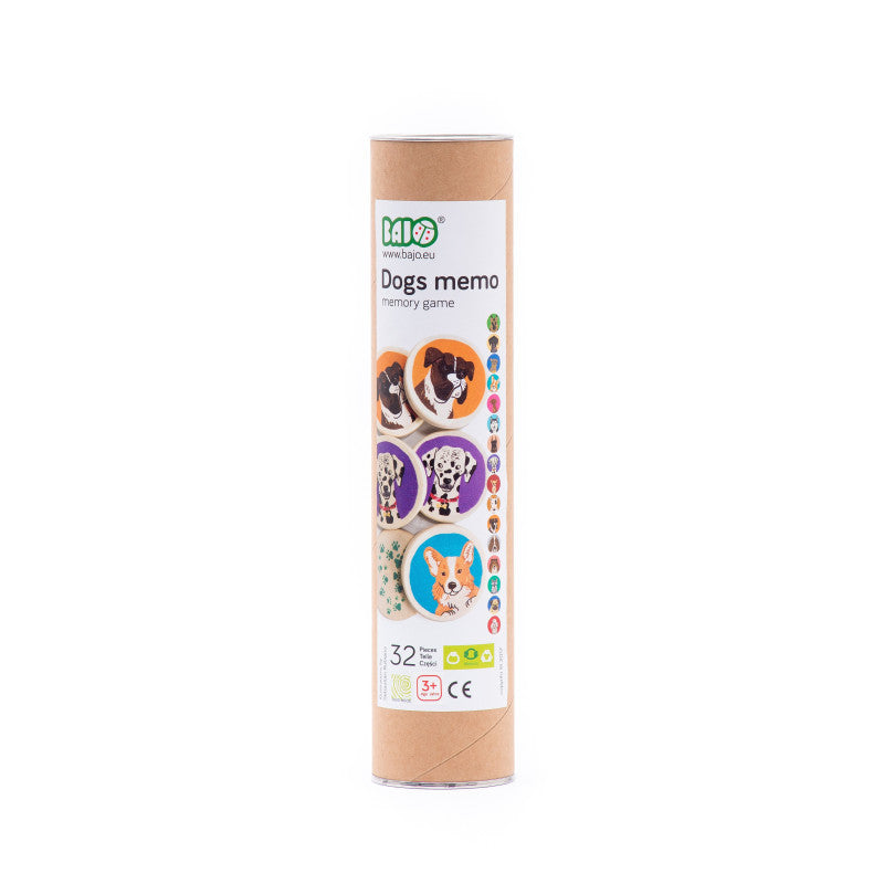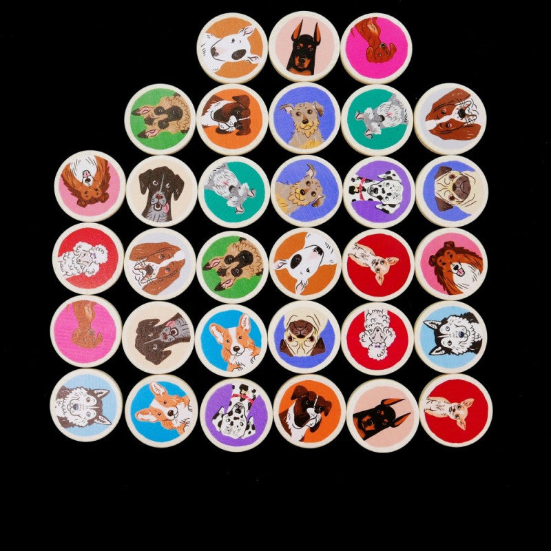 Gra Memo Psy składa się z 32 drewnianych krążków (16 par), na których przedstawiono różne rasy psów. Ta zabawa to nie tylko trening pamięci, ale także wprowadzenie do różnorodnego świata zwierząt.