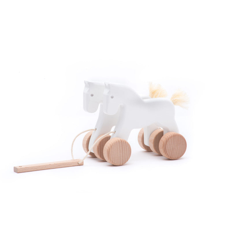 Podwójne Koniki na Sznurku to urocza drewniana zabawka, która łączy w sobie klasyczny design i funkcjonalność. Gdy dziecko ciągnie za sznurek, koniki poruszają się razem, naśladując galop prawdziwych koni, tworząc wesoły duet. Zachęcają do aktywności fizycznej oraz rozwijają wyobraźnię najmłodszych.