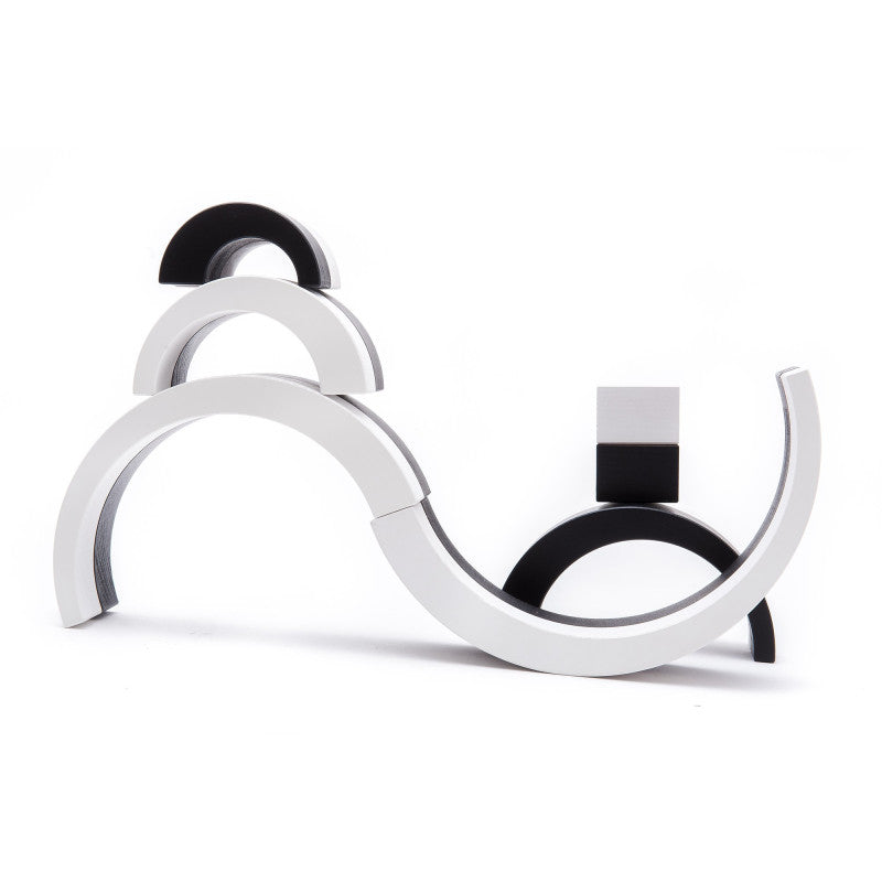 Mała tęcza to kompaktowy zestaw 6 drewnianych łuków w intensywnych kolorach – idealny do pierwszych konstrukcji i swobodnej zabawy. Każdy łuk ma unikalny kształt i kolor, a całość zachęca do budowania mostów, tuneli, wież lub abstrakcyjnych układów. Tęcza dostępna jest w dwóch wersjach kolorystycznych: klasycznej, wielobarwnej oraz eleganckiej, czarno-białej – każda z nich rozwija wyobraźnię i wrażliwość estetyczną dziecka.