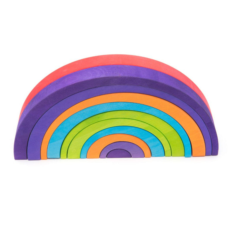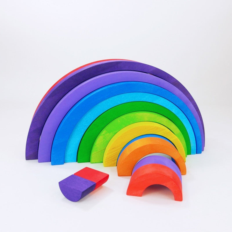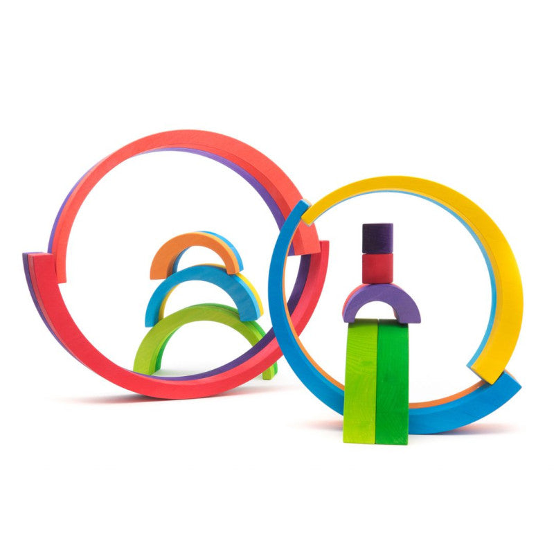 Zestaw 10 drewnianych łuków w żywych kolorach tęczy to zaproszenie do kreatywnej, otwartej zabawy. Każdy łuk jest podwójnie kolorowy – z jednej strony ma inny odcień niż z drugiej – co daje jeszcze więcej możliwości układania, budowania i eksperymentowania.