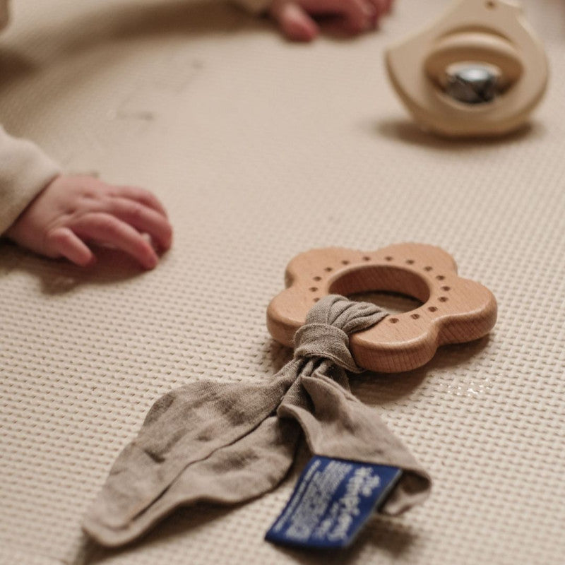 Drewniany gryzak sensoryczny - Kwiatek (tkanina konopna)
