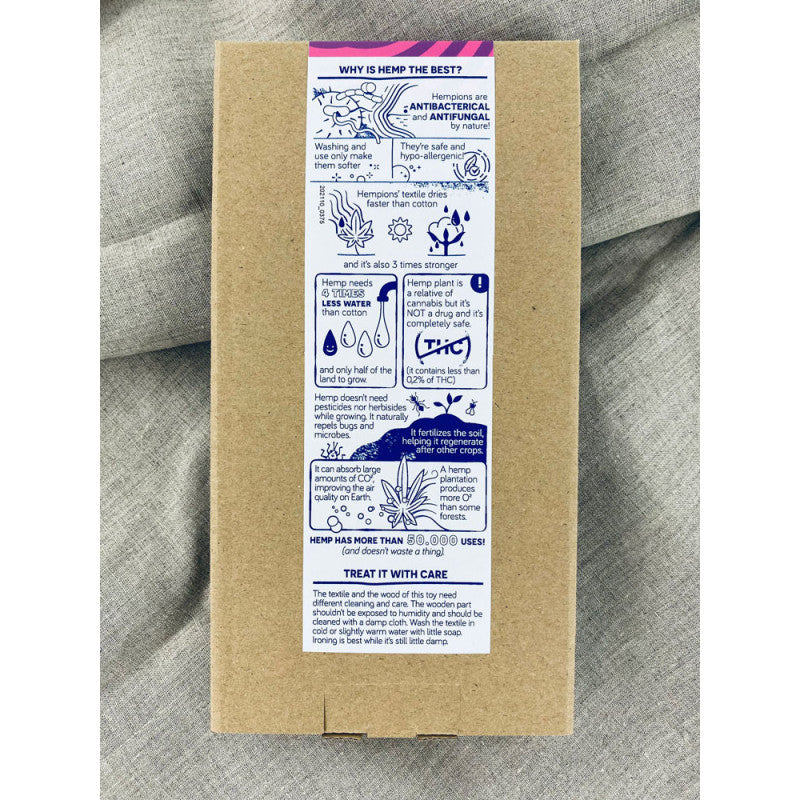 Drewniana część gryzaka ma wygrawerowane wzory, które dziecko może odkrywać paluszkami, rozwijając swoją wrażliwość dotykową. Miękka tkanina konopna dodaje różnorodności w fakturach i jest łatwa w pielęgnacji – można ją odpinać i prać, a co więcej, konopie schną wyjątkowo szybko.