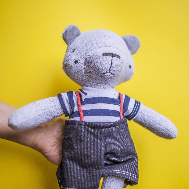 Oczy oraz wszystkie detale twarzy są haftowane. Ubranko wykonane jest z dzianinowej bawełny. Wszystkie tkaniny spełniają normę OEKO-TEX 100 i są produkowane w Polsce.