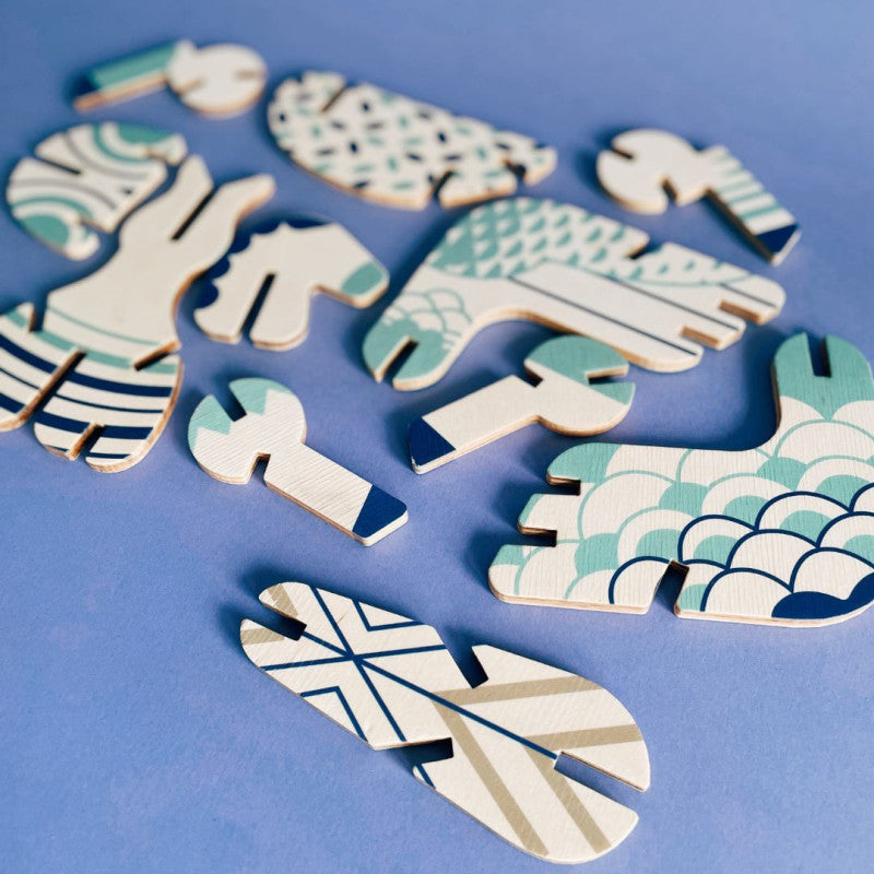 Każdy element tego zestawu został zaprojektowany tak, aby mógł stać się dowolną częścią ciała. Nadruki raz przypominają skrzydła, innym razem grzywę lub sierść - wszystko zależy od wyobraźni dziecka.